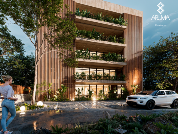 ARUMA RESIDENCE, edificio de solo 10 departamentos, 2 por piso, de 170 m2 y 210 m2, 2 recamaras, 2.5 baños, acabados de lujo, en el centro de Tulum, Lobby, seguridad, estacionamiento, Bici parking, solarium, fire pit, Rooftop Bar, alberca infinity, Beach Club Unitulum, entrega en agosto 2025.