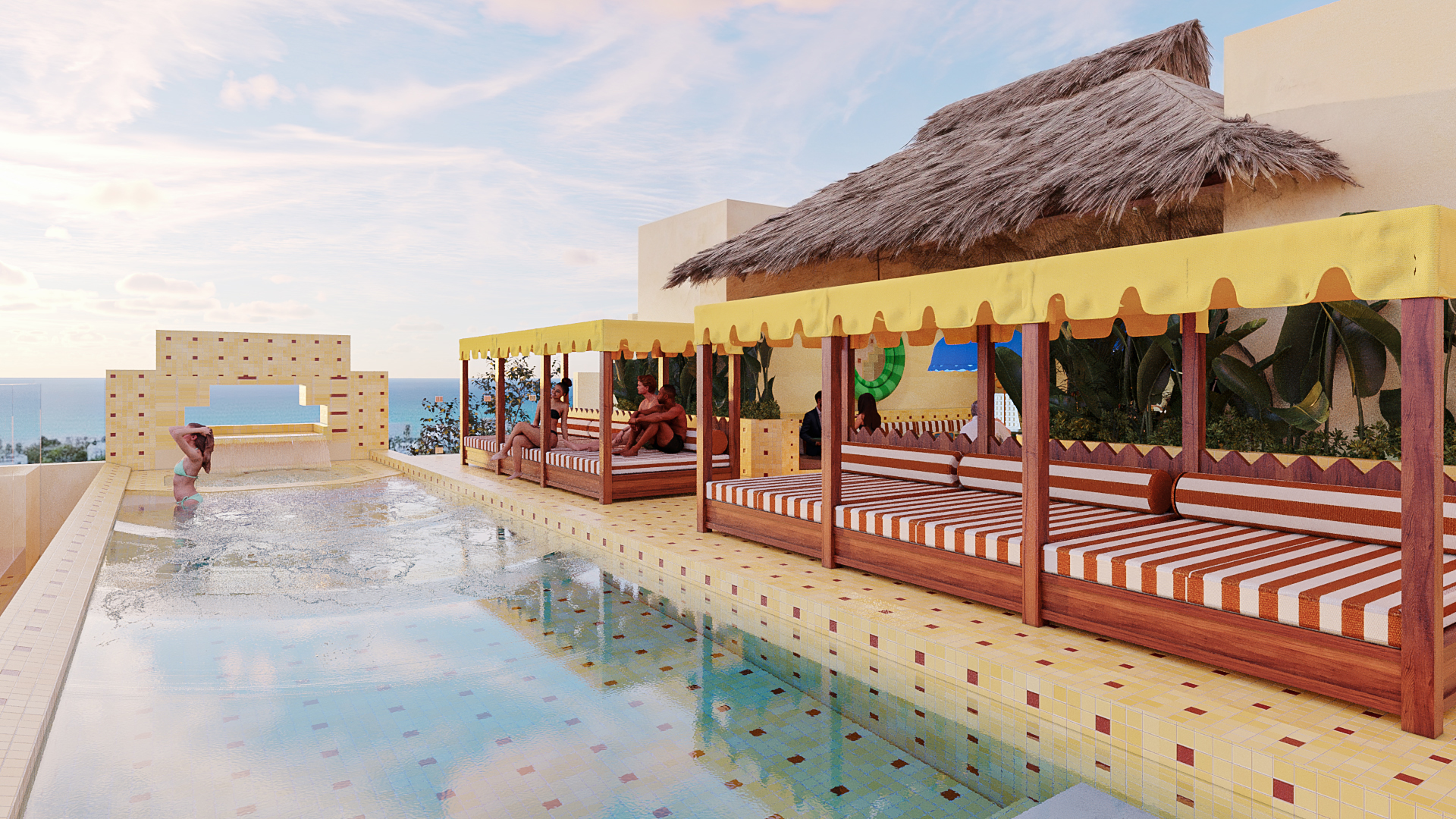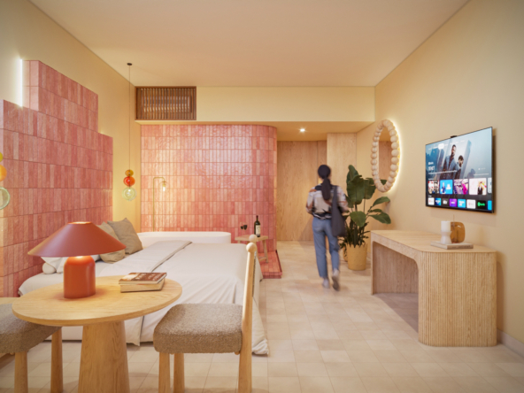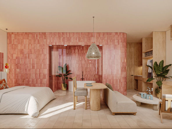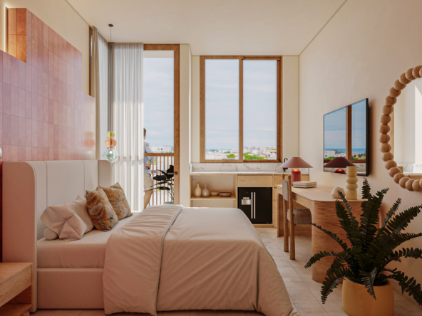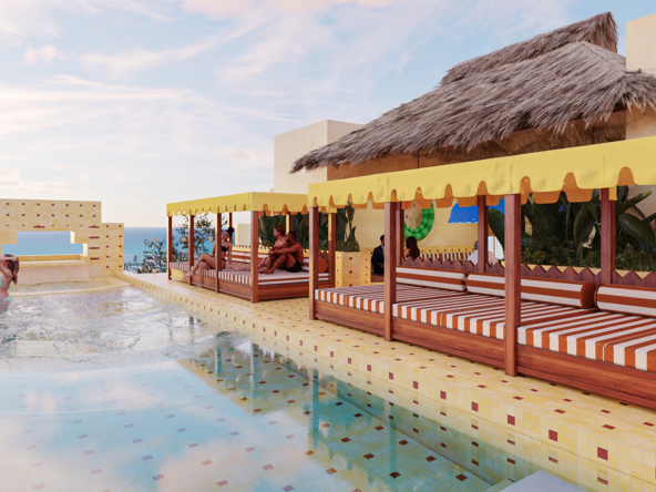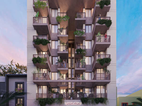 CASA ARCA, desarrollo de 60 Unidades tipo estudio de 24 a 34 m2, 6 tipologías en 7 niveles, a media cuadra de la 5a. Av. y escasos metros de la playa, seguridad, ubicación, Rooftop, alberca con vista al mar, solarium, restaurante, cafetería, Sky bar, entrega en julio de 2028.