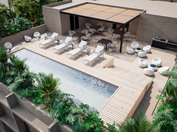 CONSTITUYENTES 80, cómodo desarrollo de 24 unidades, 16 de 1 recamara y 8 de 2 recamaras, 3 tipologías, desde 42.46 m2 hasta 72.79 m2, estacionamiento, seguridad, CCVT, Rooftop, área de parrilla, Solarium y Skypool, entrega en mayo de 2026.
