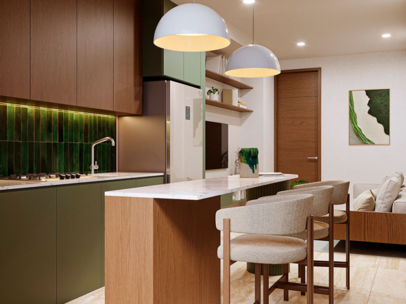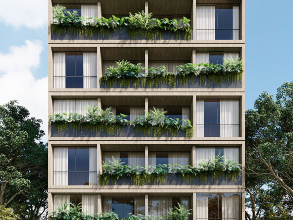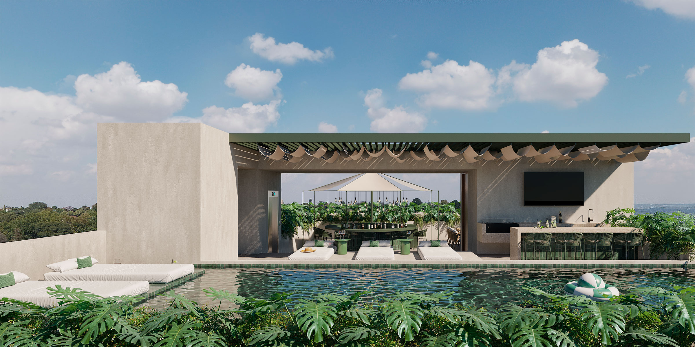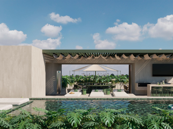 ENCANTO DE PLAYA, desarrollo de 5 niveles y Rooftop, 20 unidades de 2 recamaras de 54.9 m2, elevador, acceso controlado, estacionamiento, seguridad, alberca, asoleadero, área abierta para Wellness, poolbar y grill, entrega en junio 2027.