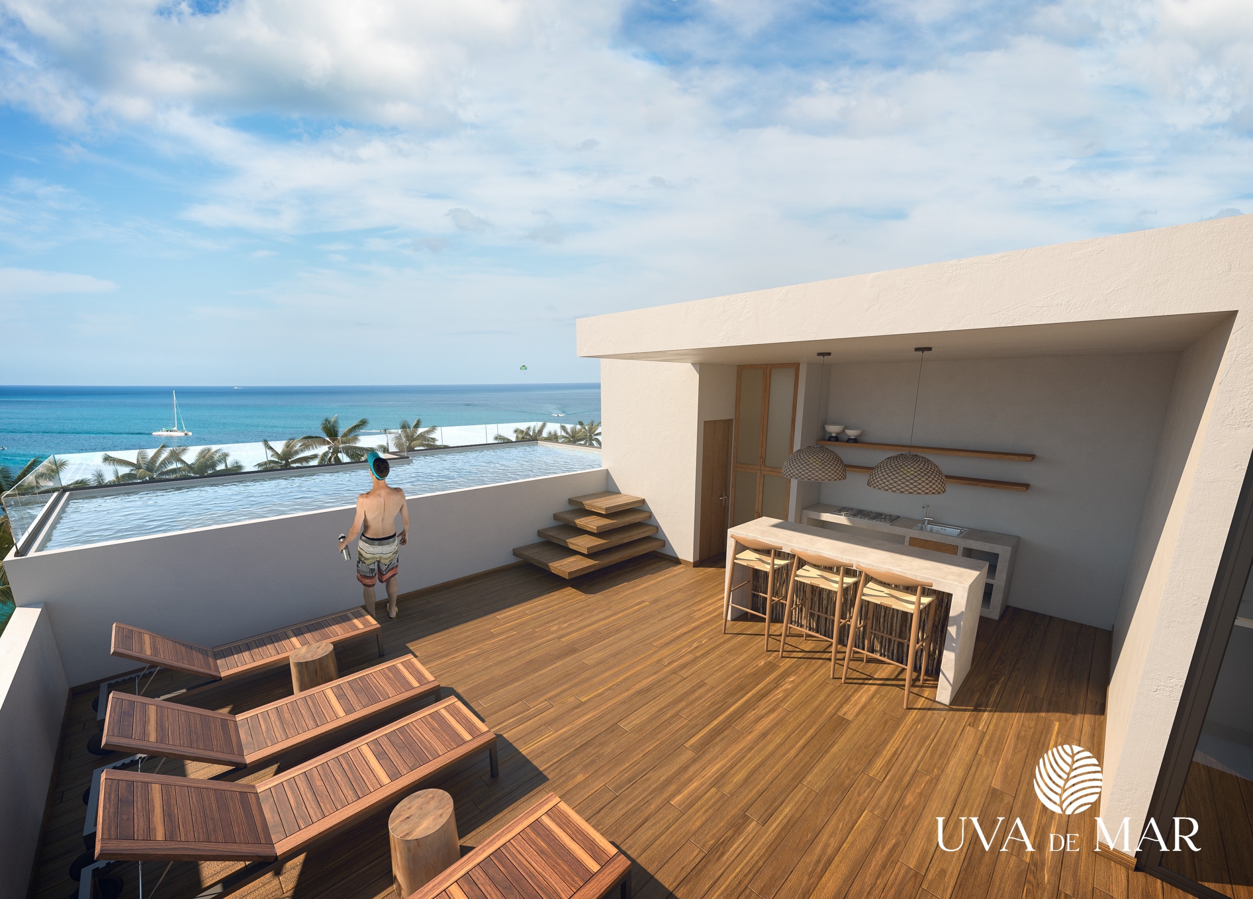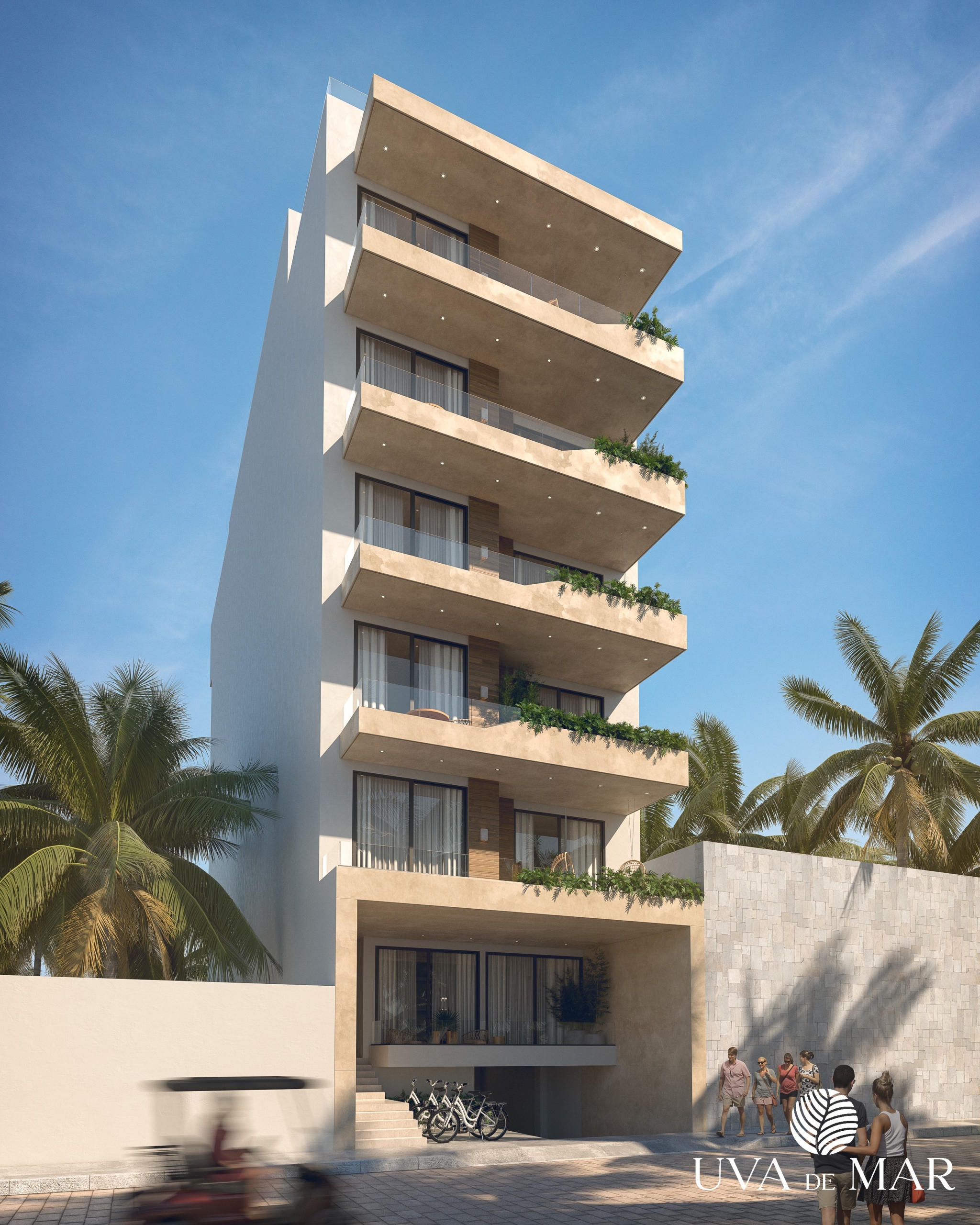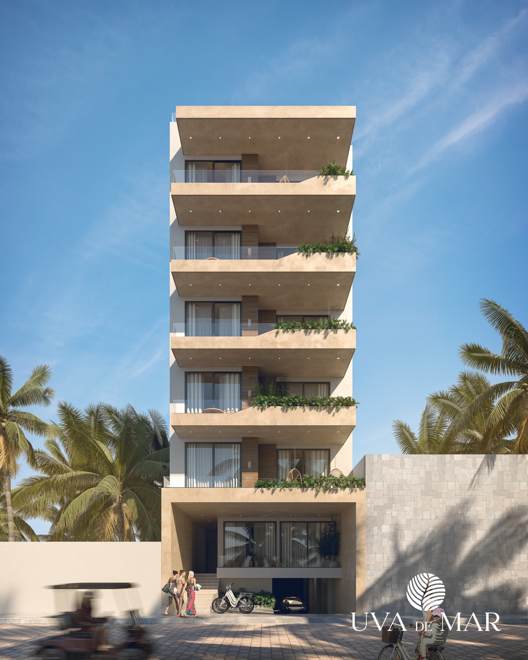 UVA DE MAR, condominio de 10 departamentos de 89 m2, 2 recamaras, amenidades, seguridad, estacionamiento común, elevador, Rofftop, alberca infinity con vista al mar, área de camastros, sala lounge, a media cuadra de la playa, entrega en agosto de 2026.