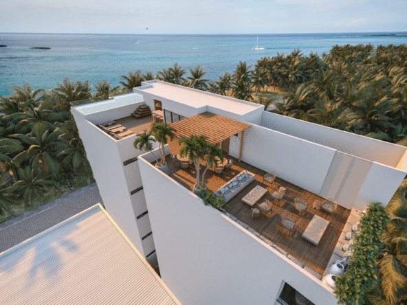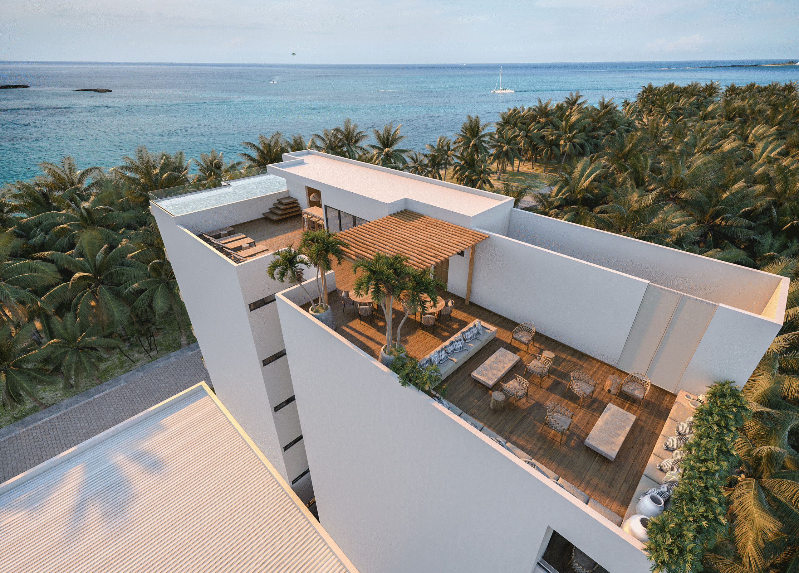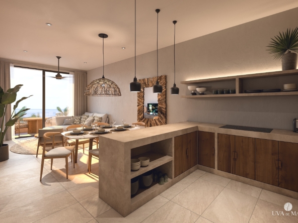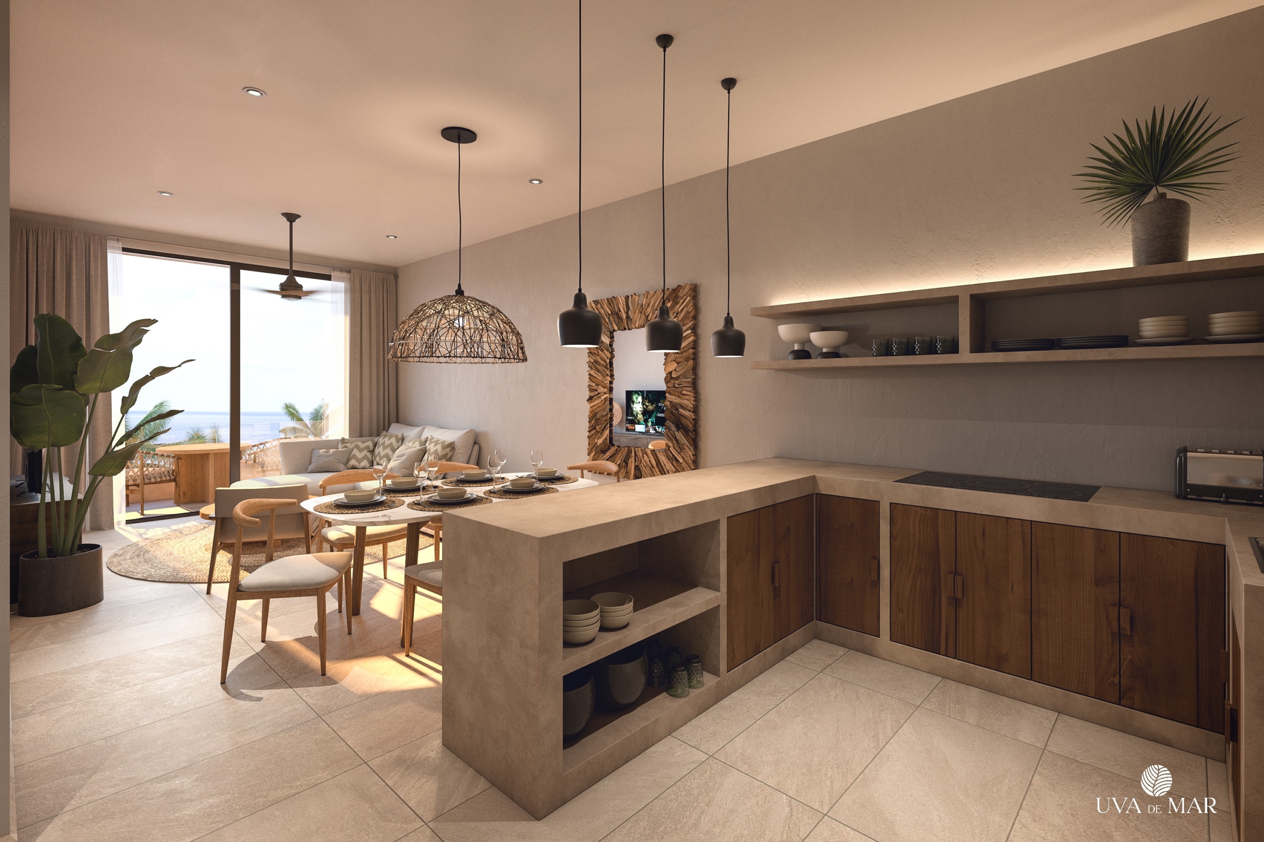 UVA DE MAR, condominio de 10 departamentos de 89 m2, 2 recamaras, amenidades, seguridad, estacionamiento común, elevador, Rofftop, alberca infinity con vista al mar, área de camastros, sala lounge, a media cuadra de la playa, entrega en agosto de 2026.